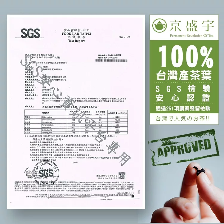 安心宣言:京盛宇的茶品皆由SGS檢驗符合台灣食品衛生安全法規,敬請安心飲用.