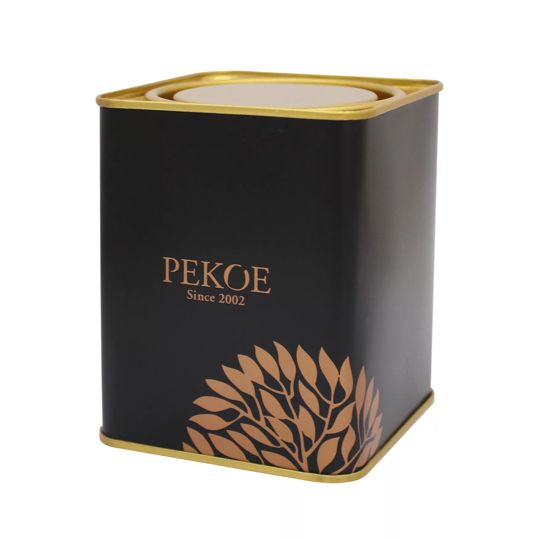 包裝特別設計古典歐風之四方金屬罐造型,採用黑色與消光金的優雅配色,散發出低調奢華、優雅從容的氣質;罐身繪有茶葉意象圖案,增添柔美溫潤質感;密合的扁型罐蓋,非常適合用來貯存您喜愛的茶葉,值得珍藏蒐集!