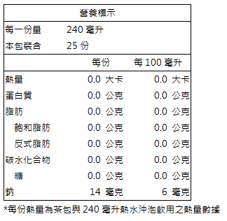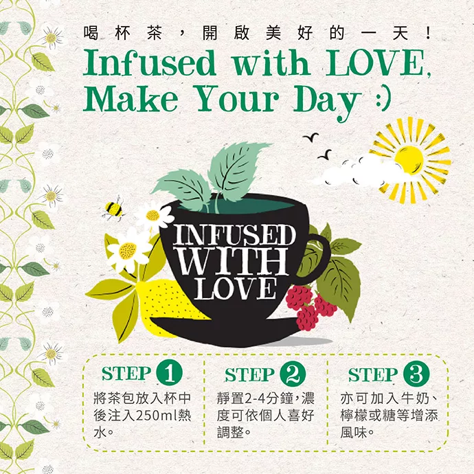 建議沖泡方式: 2.5公克茶包與240毫升熱水沖泡後即可飲用