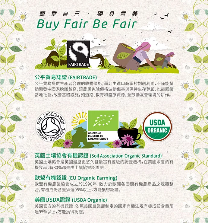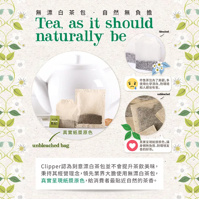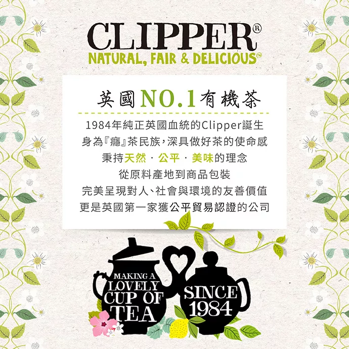 沖一壺Clipper有機茶,當美麗的茶色渲染,茶香四溢,一場全然不同的味覺旅程展開了! 純正英國血統的Clipper身為”癮”茶民族,深具做好茶的使命感,從產茶區(印度斯里蘭卡、南非)例行考察到生產包裝,Clipper講求天然、公平、美味,是英國第一家取得公平交易認證的茶公司,而因為只選用優質的有機原料,無論是紅茶或是複方草本茶都清新香醇,飲用後身心舒暢。每盒內裝10個獨立防潮茶包自然清新,芬芳香醇,適合安心天天飲用