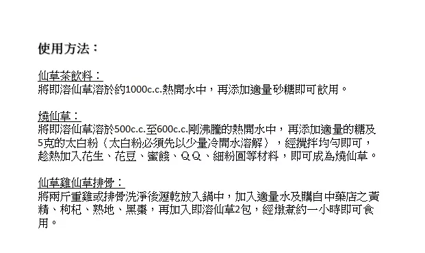 將即溶仙草溶於約1000c.c.熱開水中,再添加適量砂糖即可飲用。