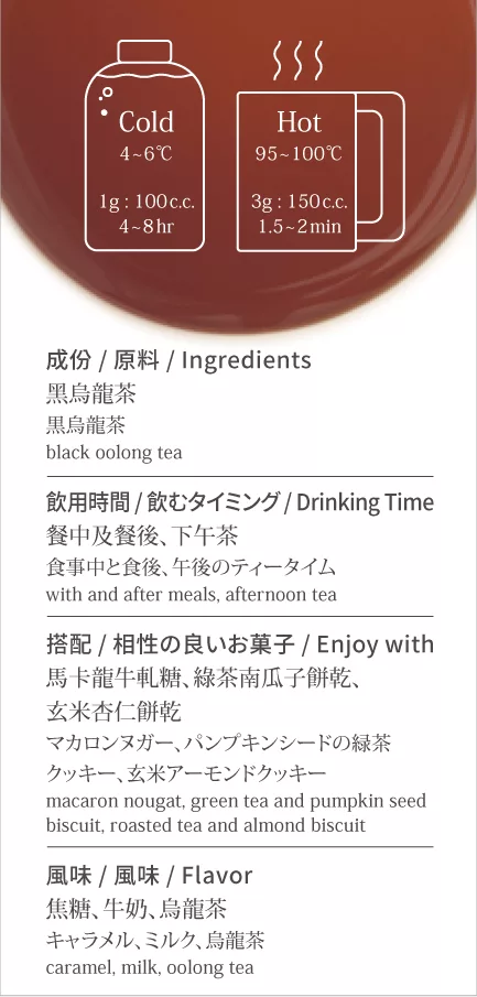 將烏龍茶反覆、長時間烘焙直至茶葉醇化而成。韻味深長悠遠,如傳統鐵觀音的渾厚口感。