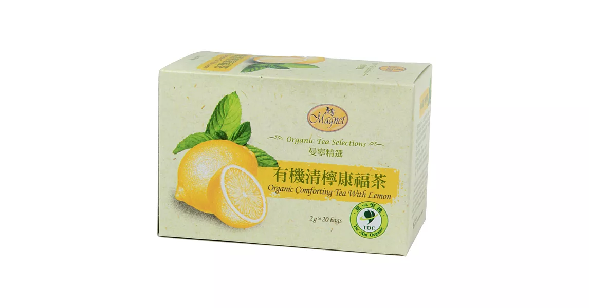 2.商品品名:曼寧有機清檸康福茶(2gx20入/盒) 3.商品重(容)量:40g 4.內容物名稱(成分)有機薄荷 、有機甘草根、有機檸檬草、天然香料(檸檬)
