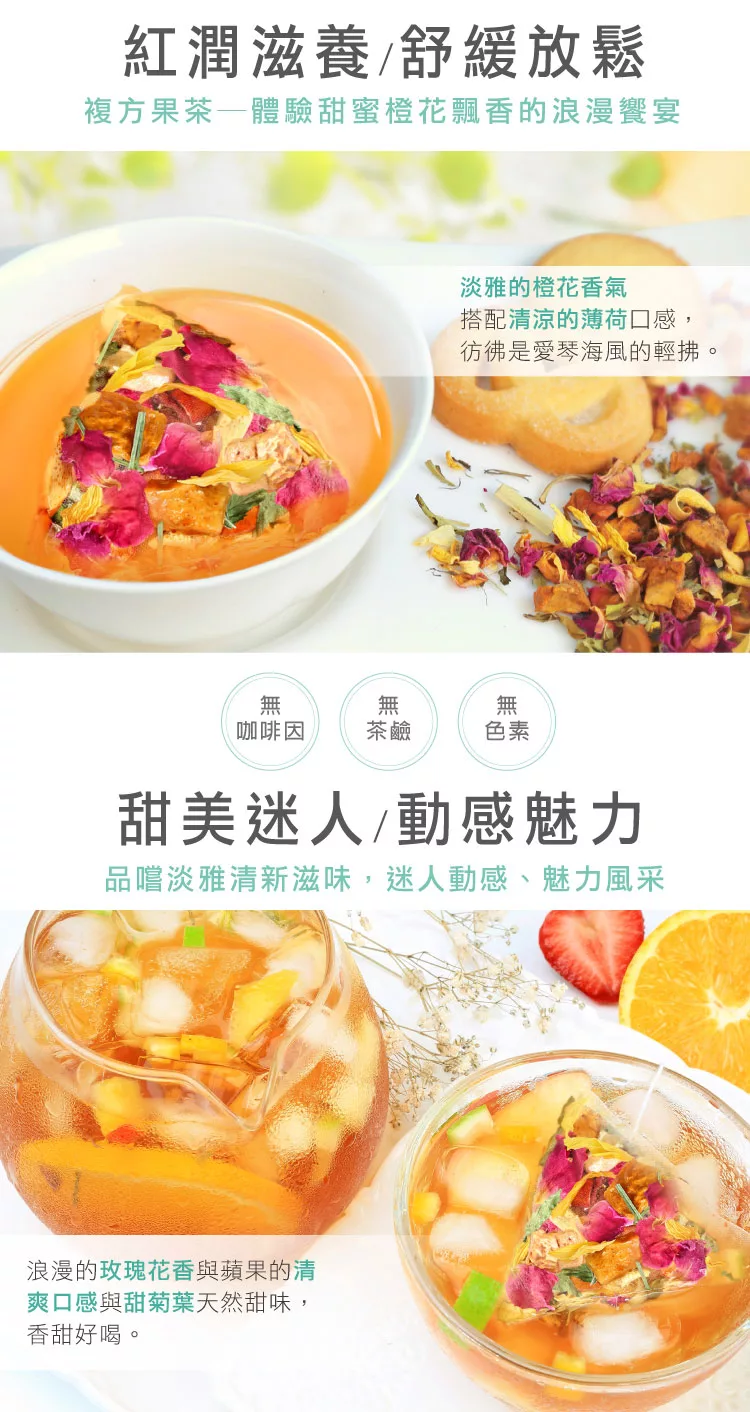 成分:蘋果、番石榴、檸檬草、草莓、向日葵、玫瑰花、胡椒薄荷、紅玫瑰、橙花、黑莓葉、甜菊葉、天然香料、酒石酸