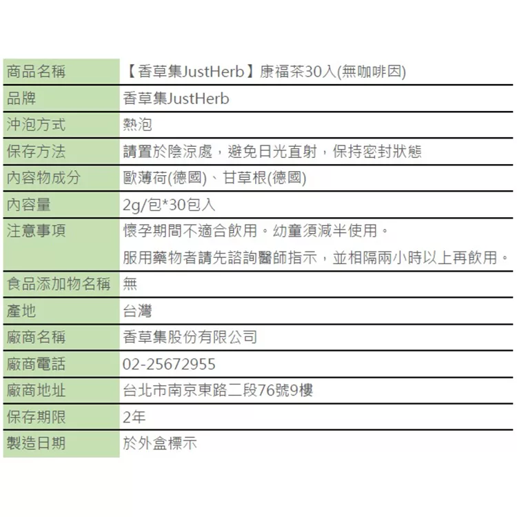 商品說明: 【香草集JustHerb】康福茶30入(無咖啡因)