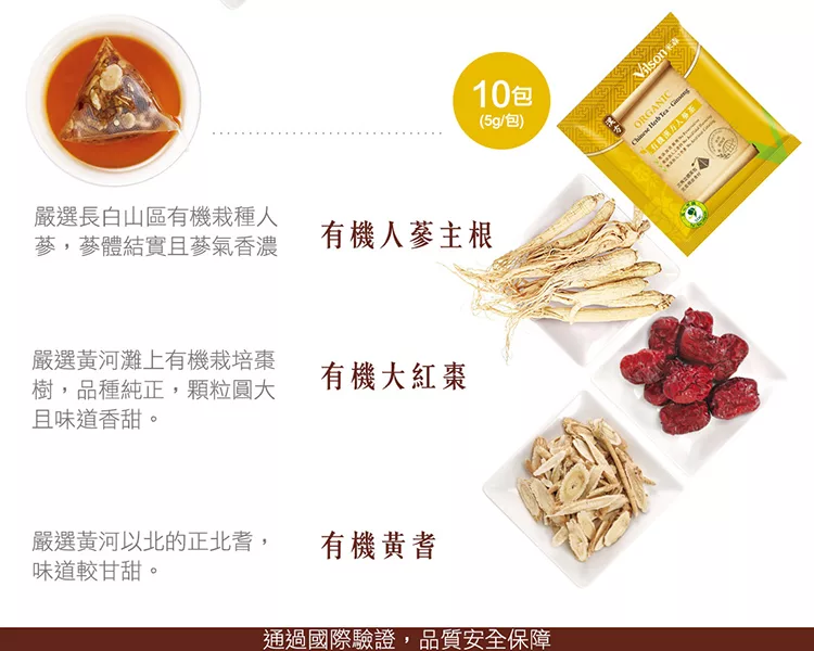 淨重:有機漢方養氣茶-6公克x20包;有機漢方人蔘茶-5公克x10包,共170公克/盒