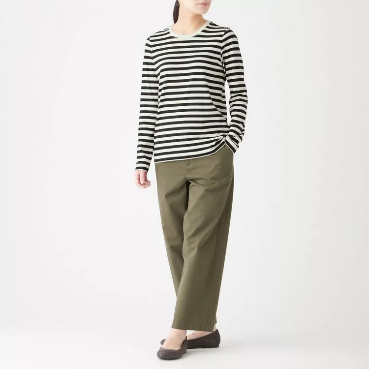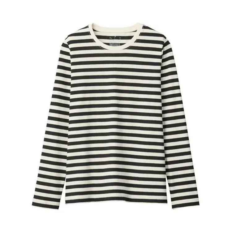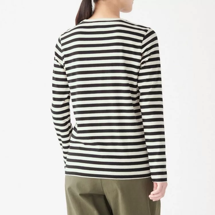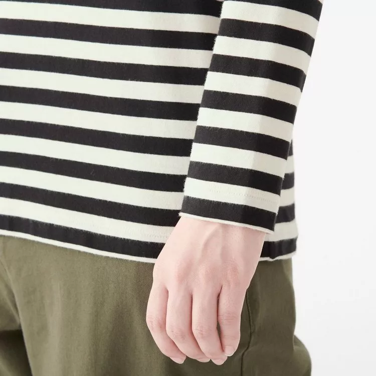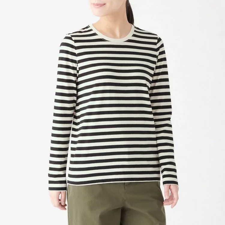 [MUJI無印良品]女印度棉天竺圓領橫紋長袖T恤M黑直紋