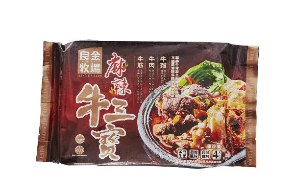 麻辣牛三寶主食材分別採用了,良金牧場嚴選金門高粱牛之牛肉、牛筋、香Q帶勁的新鮮牛肚並加入良金獨門麻辣配方,長時間熬煮口感獨特,麻辣層次分明,又香又辣,保證讓你吃了還想再吃,回味無窮。